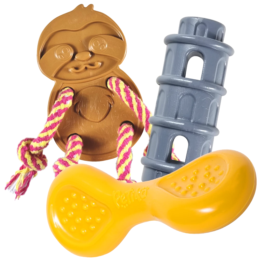 Os tipos de brinquedos que seu cachorro vai receber dependem da trilha de experiência escolhida. Esses são os tipos que a Petiko envia: brinquedos interativos para rechear, pelúcias, mordedores de borracha, mordedores de nylon, cordas 100% algodão e comedouros interativos.